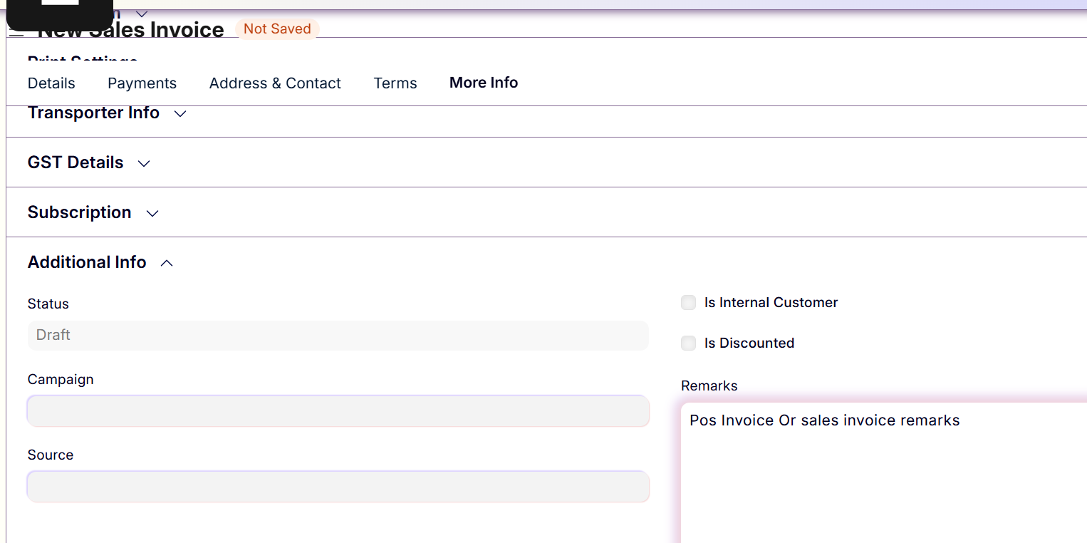 - In Additional Info / Remarks, mention the POS Invoice number