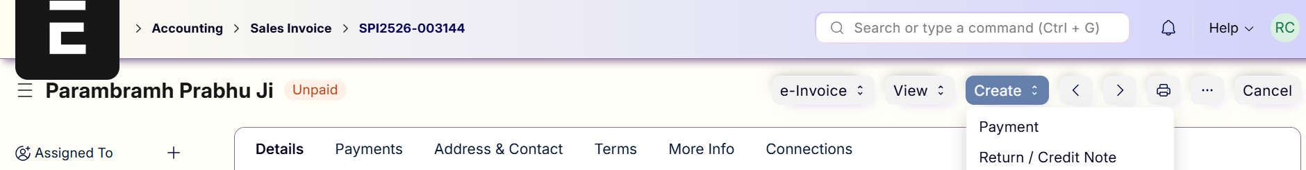 - Open the billed Sales Invoice