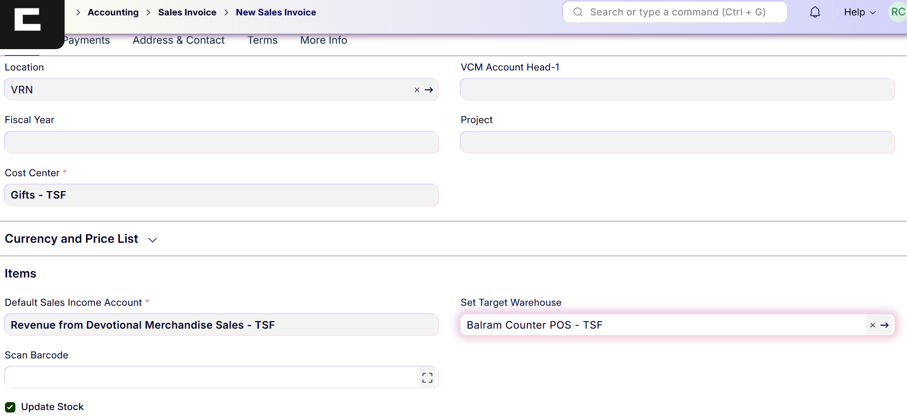 - Tick the checkbox Update Stock